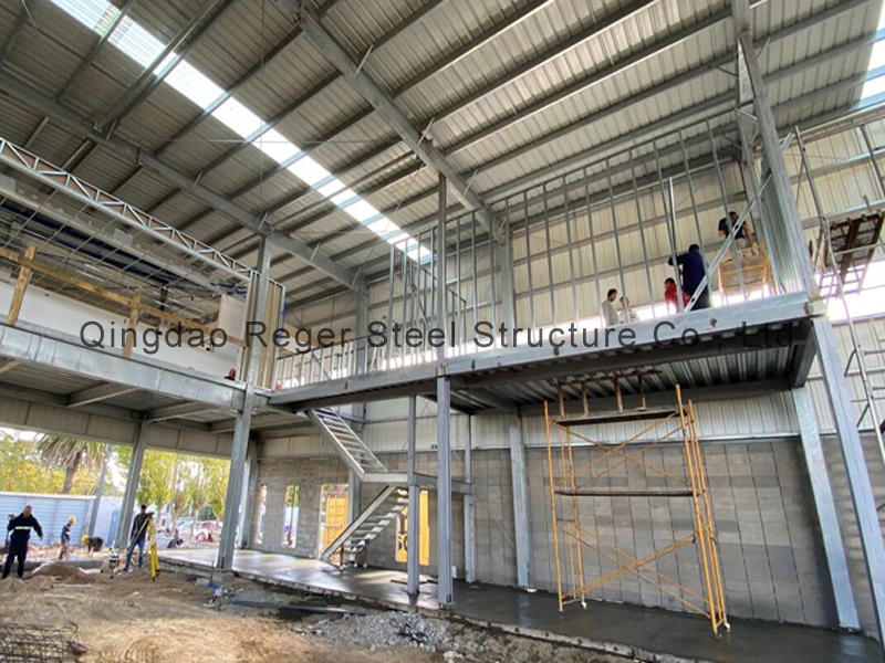 Тип каркаса складского здания представляет собой односкатную портальную рамную конструкцию с мезонином, а мезонинная часть используется как офисное помещение. Весь стальной каркас склада прошел горячую оцинковку, что обеспечивает его прочность и долговечность. Кроме того, крыши и стеновые панели изготовлены из цельных стальных листов с цветным покрытием, что обеспечивает эстетическую привлекательность и функциональность.